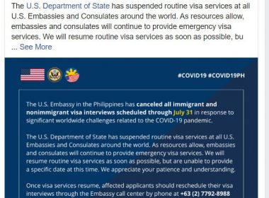 (Eagle News) — The United States embassy in the Philippines has canceled all immigrant and nonimmigrant visa interviews scheduled through July 31. In a statement on Tuesday, June 30, the US embassy said this was “in response to significant worldwide challenges related to the COVID-19 pandemic,” noting that the US Department of State has suspended routine visa services at all US embassies and consulates around the world. “As resources allow,” the embassy said US embassies and […]