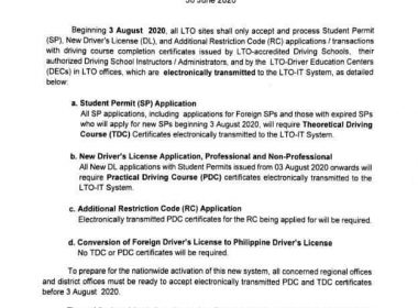 (Eagle News) — The Land Transportation Office will not accept applications for student permits starting Wednesday, July 1, to Aug. 2. The LTO said the suspension was in preparation for the implementation of the new requirement for student permits to be processed starting Aug. 3: driving course completion certificates issued by the LTO-accredited driving school, its authorized driving school instructors / administrators, and by the LTO-Driver Education Centers (DECs) in LTO offices that are “electronically […]
