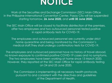 (Eagle News)–The Securities and Exchange Commission announced the temporary closure of its main office after several of its employees tested positive for COVID-19. In an advisory, the SEC said the closure of its Pasay office from today, June 26, to June 30 will facilitate a “thorough disinfection of the premises.” The SEC said the employees and outsourced personnel have no history of travel abroad, no known exposure to confirmed positive COVID-19 cases and no symptoms. […]