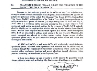 Judges, court personnel to undergo 14-day quarantine (Eagle News)–All Makati courts will be physically closed from June 25 to July 8. A memorandum from Regional Trial Court Executive Judge Elmo Alameda and Metropolitan Trial Court Jackie Crisologo Saguisag said the Offices of the Clerk of Courts will also be closed during the period when all judges and personnel will be in quarantine. The memo said this was approved by the Supreme Court’s Office of the […]