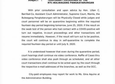 (Eagle News)–Valenzuela courts will be physically closed starting today, June 25, as judges and court personnel go on quarantine. A memo from Executive Judge Maria Nena Santos said the decision to temporarily close Bulwagang Pangkatarungan was upon advice by the Supreme Court’s Assistant Court Administrator Lilian Barribal-Co, after one person came into contact with a COVID-19-positive patient. “If the result of the swab test of the person who had contact with a COVID-positive will turn […]