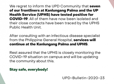 UP Diliman: 7 frontliners in Kanlungang Palma, UP Health Service COVID-19-positive