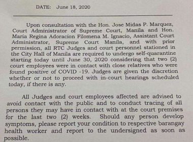 (Eagle News)–All regional trial court judges and court personnel stationed in the City Hall of Manila will undergo self-quarantine until June 30. Executive Judge Virgilio Macaraig said the quarantine–which started on Thursday, June 18–was made a requirement after two court employees had contact with their close relatives who tested positive for COVID-19. The executive judge said the decision was made upon consultation with Office of the Court Administrator chief Jose Midas Marquez and Assistant Court […]