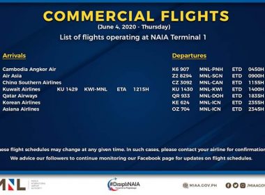 (Eagle News)–The Manila International Airport Authority has released its list of operational commercial flights. MIAA said the list was for Thursday, June 4: Flight schedules may be subject to changes. AirAsia has said it would resume its domestic flight operations on June 5, following the transition of some areas, including Metro Manila, to a general community quarantine. The Bureau of Immigration said its operations remain downscaled at the Ninoy Aquino International Airport as international travel […]