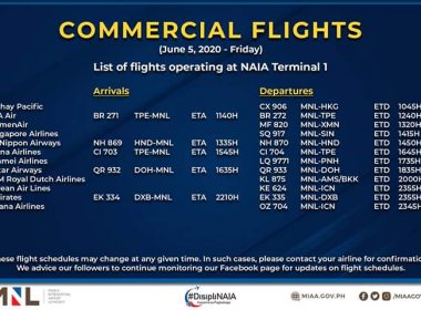 (Eagle News)–The Manila International Airport Authority has released its list of operational commercial flights. MIAA said the list was for Friday, June 5: Flight schedules may be subject to changes, MIAA said. Several airlines have announced the resumption of domestic flight operations as Metro Manila and several areas transition into a general community quarantine. Transportation Secretary Art Tugade had said the domestic flights were allowed for as long as there was approval from the concerned […]