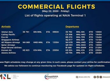 (Eagle News)–The Manila International Airport Authority has released its list of operational commercial flights. MIAA said the list was for Friday, May 22: Flight schedules may be subject to changes. Earlier, Cebu Pacific said it was extending the cancellation of its flights to May 31. The airline said this was in view of the modified enhanced community quarantine imposed on Metro Manila starting May 16 amid the COVID-19 pandemic. All flight operations are concentrated in […]