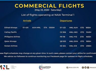 (Eagle News)–The Manila International Airport Authority has released its list of operational commercial flights. MIAA said the list was for Saturday, May 23: Cebu Pacific flights remain cancelled until May 31 in view of the modified enhanced community quarantine imposed on Metro Manila. All flight operations remain concentrated at the Ninoy Aquino International Airport Terminal 1 to reduce the risk of exposure of airport workers to the COVID-19 virus, MIAA had said.