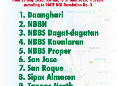 (Eagle News)–Ten barangays in Navotas have been placed under an enhanced community quarantine. Mayor Toby Tiangco said Barangays NBBS Dagat-Dagatan, NBBS Kaunlaran, NBBS Proper, San Jose, NBBN, Sipac Almacen, Daanghari, Tangos North, Tangos South, and San Roque are under the ECQ starting today to May 31, at 11:59 p.m., following the approval of the Regional Inter-Agency Task Force for the Management of Emerging Infectious Diseases. Under the ECQ, Tiangco said only those with home quarantine […]