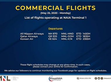 (Eagle News)–The Manila International Airport Authority has released its list of operational commercial flights. MIAA said the list was for Monday, May 25: Flight schedules may be subject to changes. All flight operations, MIAA said, are concentrated at the Ninoy Aquino International Airport Terminal 1 starting May 28. MIAA said this was in a bid to reduce the risk of exposure of airport workers to the COVID-19 virus.