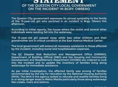 (Eagle News)–The Quezon City government expressed condolences to the family of a 13-year-old girl who died after her house fell into a waterway recently. In a statement on Monday, the local government said also critically injured in the incident in Barangay Obrero were two other children and their grandmother, who are confined at the East Avenue Medical Center. According to the local government, based on initial investigation, the affected family was among 47 families recommended by […]