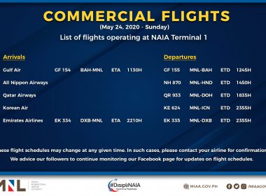 (Eagle News) — The Manila International Airport Authority has released its list of operational commercial flights. MIAA said the list was for Sunday, May 24: Flight schedules may be subject to changes. Earlier, Cebu Pacific and Cebgo announced the cancellation of their flights had been extended until May 31. This was in view of the modified enhanced community quarantine imposed in Metro Manila. MIAA said all flight operations are concentrated at the Ninoy Aquino International […]