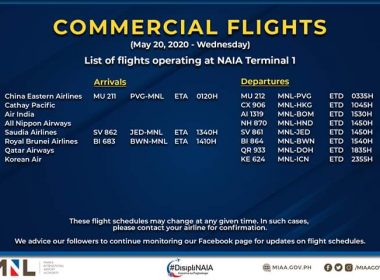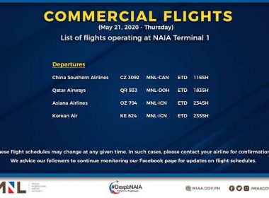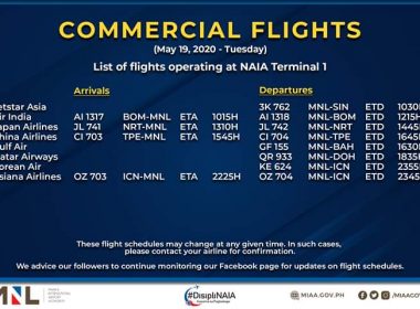 (Eagle News)–The Manila International Airport Authority has released its list of operational commercial flights. MIAA said the list was as of Wednesday, May 20: All flight schedules are subject to changes. Cebu Pacific earlier extended the cancellation of its flights until May 31 in view of the modified enhanced community quarantine imposed in Metro Manila. All flights are concentrated at the Ninoy Aquino International Airport Terminal 1 in a bid to reduce the risk of […]