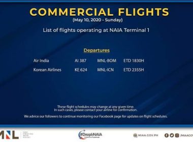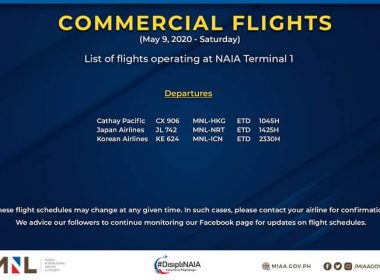 (Eagle News)–The Manila International Airport Authority has released its list of operational commercial flights. MIAA said the list was for Sunday, May 10: Earlier, AirAsia, Philippine Airlines and Cebu Pacific cancelled their flights until May 15 in view of the extension of the enhanced community quarantine in some parts of the country. On Saturday, MIAA said starting May 11, inbound flights are already allowed in the country but only on assigned dates. The government had […]