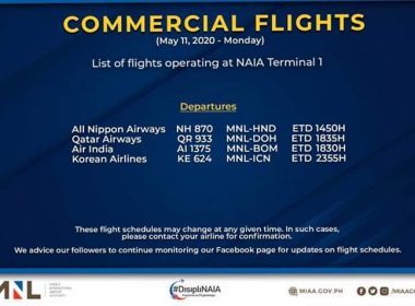 (Eagle News)–The Manila International Airport Authority has released its list of operational commercial flights. MIAA said the list was for Monday, May 11: Flight schedules are subject to changes, MIAA said. Today, May 11, marks the start of lifting of the ban on select inbound flights into the Ninoy Aquino International Airport. Earlier, MIAA said inbound domestic and international flights, however, will be assigned specific days for landing. MIAA later said only flights with Filipino […]