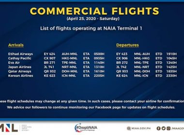 (Eagle News)–The Manila International Airport Authority has released its list of operational commercial flights. MIAA said the list was for Saturday, April 25: Flight schedules may be subject to changes. MIAA earlier said all flights are concentrated in the Ninoy Aquino International Airport in a bid to reduce the risk of exposure of airport workers to the COVID19 virus. The Bureau of Immigration has said the travel restrictions imposed during the enhanced community quarantine will […]