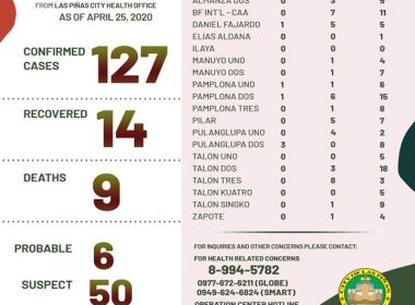 (Eagle News)–The number of coronavirus disease 2019 cases in Las Piñas has risen to 127. The local government said Talon Dos still has the most cases, with 18, followed by Pamplona Dos with 15. BF International Village-CAA had the third highest number of cases with 11. According to the local government, of the 127, 14 have recovered and nine have died. There are six probable cases and 50 suspected cases. The Philippines COVID-19 cases have […]