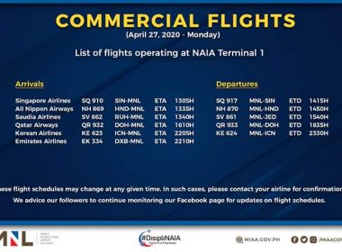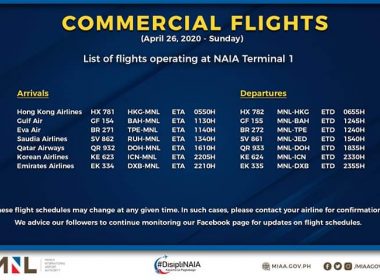 (Eagle News)–The Manila International Airport Authority has released its list of operational commercial flights. MIAA said the list was for today, April 27: Passengers were nonetheless advised to check airline websites or social media accounts as flight schedules may be subject to changes. MIAA earlier said all flights are now concentrated in the Ninoy Aquino International Airport Terminal 1 in a bid to reduce the risk of exposure of airport workers to the COVID-19 virus. […]