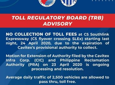 (Eagle News)–There will be no collection of toll fees at the C5 flyover crossing the South Luzon Expressway. The Department of Transportation said according to the Toll Regulatory Board, the no-collection policy started on Friday, April 24, following the expiration of Cavitex’s provisional authority to collect. The DOTr said Cavitex Infra Corp. and the Philippine Reclamation Authority filed a motion for extension of authority on April 23, but this is still “ongoing processing and resolution.” […]