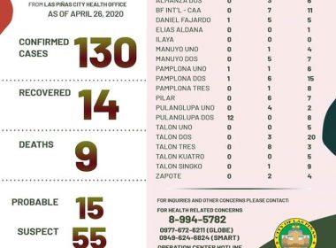 (Eagle News)–The number of coronavirus disease 2019 cases in Las Piñas has reached 130. The local government said based on City Health Office data, of the 130, 14 have recovered while nine have died. Talon Dos has recorded the most COVID-19 cases with 20, followed by Pamplona Dos with 15 and BF International Village-CAA with 11. Only Barangay Ilaya has zero COVID-19 cases so far. The local government said 15 are probable cases while 55 […]