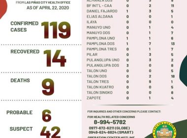 (Eagle News)–The number of coronavirus disease-2019 cases in Las Piñas has reached 119. According to the local government, Talon Dos recorded the most cases, with 18. It was followed by Pamplona Dos with 13 cases and Barangay International Village-CAA with 11. Of the 119, 14 have recovered while nine have died. The Philippines has so far confirmed over 6700 cases, with recoveries widening their lead over deaths.