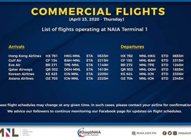 (Eagle News)–The Manila International Airport Authority has released its list of operational commercial flights. MIAA said the list was for Thursday, April 23: Flight schedules, MIAA said, can be subjected to changes. MIAA earlier said all flights are now concentrated in the Ninoy Aquino International Airport Terminal 1 in a bid to reduce the risk of exposure of airport workers to the virus that causes the coronavirus disease 2019. There have so far been limited […]