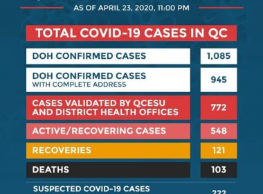 (Eagle News)–Quezon City has recorded 13 new COVID-19 cases, bringing the total to 1085. The local government said this was based on Department of Health data. Of the figure, 772 have been validated by the city’s Epidemiology and Disease Surveillance Unit. The local government said Batasan Hills still had the most cases, at 33. Batasan Hills also had the most number of deaths, at 7, followed by Tandang Sora at 6. Recoveries have reached 121, […]