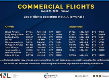 (Eagle News)–The Manila International Airport Authority has released its list of operational commercial flights. MIAA said the list was for Friday, April 24: Flight schedules may be subject to changes. MIAA earlier said all flights are now concentrated in the Ninoy Aquino International Airport Terminal 1 in a bid to reduce the risk of exposure of airport workers to the COVID-19 virus. President Rodrigo Duterte has extended the enhanced community quarantine in select areas, including […]