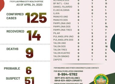 (Eagle News)–The number of COVID-19 Las Piñas has reached 125. The local government said Talon Dos has recorded the most cases, with 18. It was followed by Pamplona Dos with 14, and BF International Village-CAA with 11. The local government said of the 125 cases, 14 have recovered and nine have died. There are six probable cases and 51 suspected cases. The Philippines COVID-19 cases are so far nearing the 7000 mark, with recoveries keeping […]