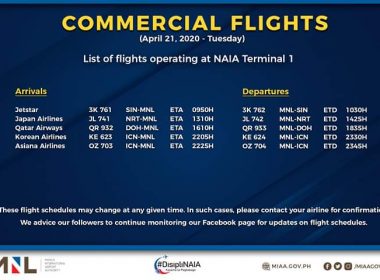 (Eagle News)–The Manila International Airport Authority has released its list of operational commercial flights. MIAA said the list was for Tuesday, April 21: The flight schedules, MIAA said, may still be subject to changes. Flight operations have been limited in the country since President Rodrigo Duterte placed Luzon in an enhanced community quarantine to contain COVID-19. The country has so far recorded over 6000 cases.