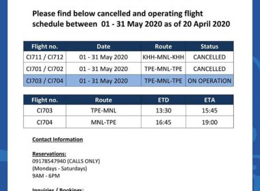 (Eagle News)–China Airlines has announced the cancellation of several of its flights from May 1 to 31. In an advisory, the airline said the following flights have been cancelled: CI 711/CI 722 – Kaohsiung-Manila-Kaohsiung CI 701/CI 702 – Taipei-Manila-Taipei The cancellation came amid simulations of a lockdown in several areas in the country against COVID-19.