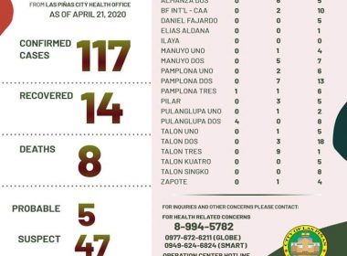 (Eagle News)–The number of coronavirus disease 2019 cases in Las Piñas has now reached 117. The Las Piñas government said of the 117, 14 have recovered while eight have died. Talon Dos has recorded the most cases, with 18. It was followed by Pamplona Dos with 13 and BF International Village-CAA with ten. The local government has recorded five probable cases and 47 suspected cases. The Philippines has so far confirmed over 6000 COVID-19 cases, […]