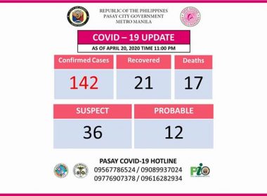 (Eagle News)–The number of coronavirus disease 2019 cases in Pasay has reached 142. According to the Pasay government, of the 142, 21 have recovered while 17 have died. Barangay 183 has the most number of COVID-19 cases, at 16, followed by ten for Barangay 34. The local government said 36 were suspect cases, while 12 were probable. “Wag po tayong magpaka-kampante,” the local government said as it reminded residents to stay at home, practice physical […]