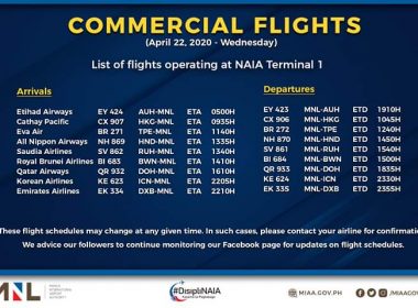 (Eagle News)–The Manila International Airport Authority has released its list of operational commercial flights. MIAA said the list was for Wednesday, April 22: Flight schedules may be subject to changes, MIAA said. Flight operations have been reduced amid the COVID-19 pandemic, with the MIAA saying all flights would be concentrated in Terminal 1 of the Ninoy Aquino International Airport. MIAA said this was in a bid to reduce the risk of exposure of airport workers […]