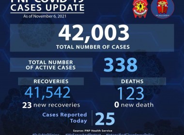 (Eagle News)–COVID-19 cases among police personnel have breached the 42,000 mark, Philippine National Police data showed on Saturday, Nov. 6. According to the data, the 42,003 total was after 25 more cases were reported. Of the total cases, the PNP said 338 are active. Twenty-three additional recoveries pushed the total PNP recoveries to 41542. No additional deaths were reported, which means the PNP COVID-19 death toll remains at 123. The police force has said over […]