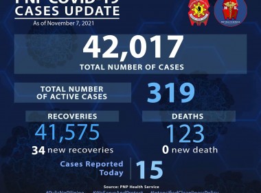 (Eagle News) — Fifteen more COVID-19 cases have been reported among police personnel. Data on Sunday, Nov. 7, showed the additional cases pushed the total PNP COVID-19 cases to 42,017 cases. Of these, 319 are active. Recoveries rose to 41,575 with the addition of 34 recoveries. The PNP COVID-19 death toll is at 123, with no additional deaths reported. The police are among the country’s frontliners amid the COVID-19 pandemic. The PNP has said over […]