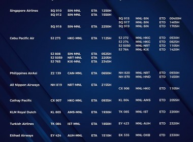 (Eagle News)–The Manila International Airport Authority has released its list of operational commercial flights for Sunday, Nov. 7: Flight schedules may change at any given time. MIAA advised passengers to get confirmation of their flights as only those with the confirmation will be allowed to enter the airport. The Bureau of Immigration has said tourists are still not allowed to enter the Philippines.