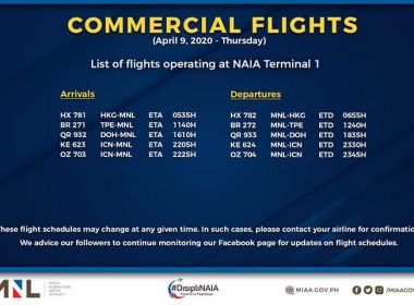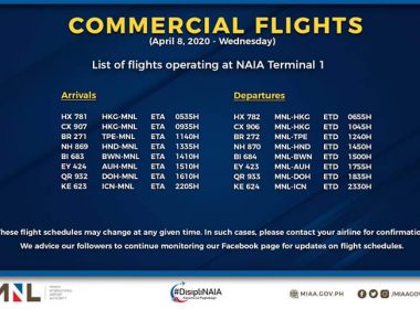 (Eagle News)–The Manila International Airport Authority has released its list of operational commercial flights. MIAA said the list was as of Thursday, April 9: The flight schedules, MIAA said, may be subject to changes “at any given time.” Earlier, several airlines cancelled their international and domestic flights until April 30, following the extension of the enhanced community quarantine. The Philippines has so far confirmed over 3000 COVID-19 cases.