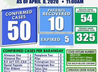 (Eagle News)–The number of coronavirus disease 2019 cases in Las Piñas has reached 50. The local government said of the 50 as of Wednesday, April 8, one each was from Almanza Uno, Barangay Daniel Fajardo, and Barangay Elias Aldana; two each from Manuyo Uno, Pamplona Tres, Pulanglupa Uno, Pulanglupa Dos, and Talon Uno; three each from Talon Kuwatro and Pamplona Uno; four each from Pamplona Dos and Zapote; five each from Manuyo Dos and Pilar; […]