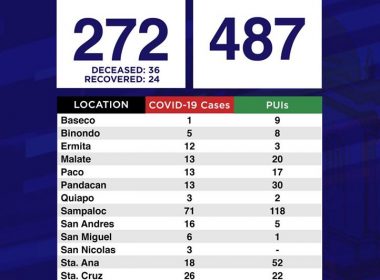 (Eagle News) – The Manila Health Department (MHD) reported six new cases of coronavirus in the city, bringing the total number of cases to 272. As of latest count, the city has 36 deaths and 24 recoveries, with 487 persons under investigation for the disease. Majority of the COVID-19 cases were recorded in Sampaloc (71 cases) which covers the university belt area, followed by Tondo 2 (31 cases), Sta. Cruz (26 cases), Tondo 1 (31 […]