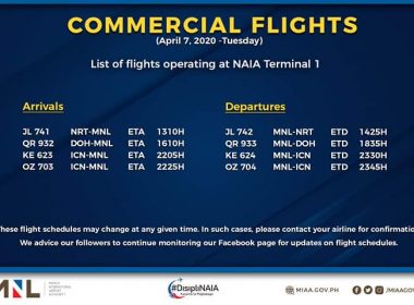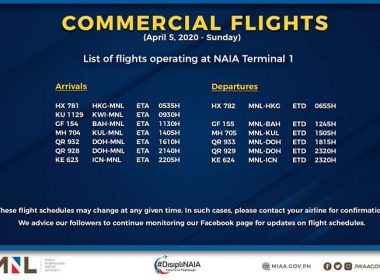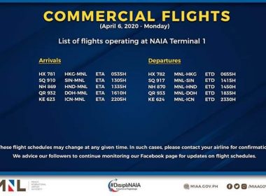(Eagle News)–The Manila International Airport Authority has released its list of operational commercial flights. MIAA said the list was as of Tuesday, April 7: It said flight schedules may be subjected to changes. In these cases, MIAA said passengers should coordinate with the airline concerned. MIAA has announced all flights shall be concentrated in the Ninoy Aquino International Airport Terminal 1 in a bid to reduce the risk of exposure of airport workers to the […]