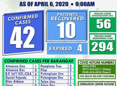 (Eagle News)–The Las Piñas government has so far recorded 42 cases. Of the 42, the local government said one each was from Almanza Uno, Barangay Daniel Fajardo, Barangay Elias Aldana, Manuyo Uno, Pulanglupa Uno and Talon Uno; two each from Pamplona Tres, Pulanglupa Dos and Talon Kuatro; three each from Pamplona Uno, Pamplona Dos and Zapote; four from Manuyo Dos; five from Pilar; and six each from BF International Village-CAA and Talon Dos. The local […]