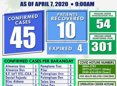 (Eagle News)–The Las Piñas government has confirmed 45 coronavirus disease 2019 cases. In its update on Tuesday, April 7, the local government said of the 45, one each was from Almanza Uno, Barangay Daniel Fajardo, Barangay Elias Aldana and Manuyo Uno; two each from Pamplona Tres, Pulanglupa Uno, Pulanglupa Dos and Talon Uno; three each from Pamplona Uno, Pamplona Dos, Talon Kuatro and Zapote; and four from Manuyo Dos. Five were from Pilar and six […]