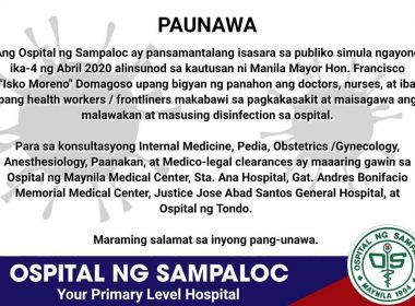(Eagle News) – Manila Mayor Francisco “Isko Moreno” Domagoso has ordered the temporary closure of Ospital ng Sampaloc after five employees of the hospital tested positive for coronavirus. “As of today, may lima po tayong hospital staff na positibo sa COVID-19 sa Sampaloc. Labing-apat na doktor, naka-quarantine. Walong nurse, naka-quarantine. Pitong admin staff, naka-quarantine“, the Manila mayor said in an online statement. He said that the temporary closure will give the affected doctors and hospital […]