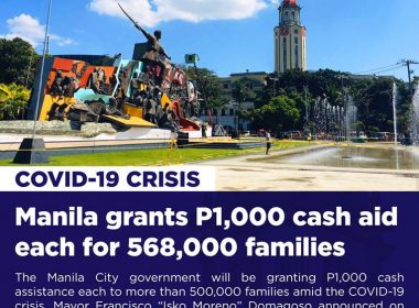 (Eagle News) – More than 500,000 families in Manila will receive P1,000 cash assistance from the city government beginning Tuesday, April 7. Manila Mayor Francisco “Isko Moreno” Domagoso announced the cash assistance after signing Ordinance No. 8625, or the City Amelioration Crisis Assistance Fund, which authorized the allocation of P591 million as financial aid to about 568,000 families in the city. “House-to-house po (ang distribution), wala pong pila. Lahat ng itinala ninyo ay dapat n’yong […]