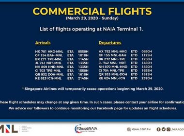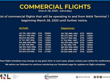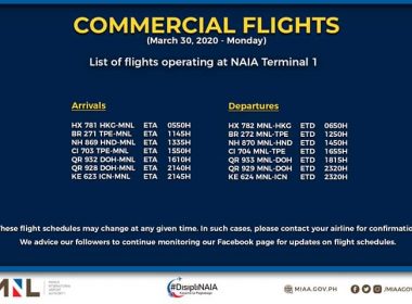 (Eagle News)–The Manila International Airport Authority has released its list of operational flights. MIAA said the following list is as of March 29: “These flight schedules may change at any given time,” MIAA said. MIAA said in such cases, passengers should contact the airline for confirmation. Earlier, MIAA said all flight operations will be concentrated at the Ninoy Aquino International Airport Terminal 1 in a bid to reduce the risk of exposure to the coronavirus […]
