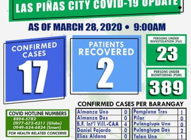 (Eagle News)–Las Piñas has confirmed 17 coronavirus disease 2019 cases. The city government said of the 17, four were from BF International Village-CAA, two from Manuyo Dos, one each from Talon Uno and Pamplona Tres, two each from Pulang Lupa Dos, Talon Dos and Talon Kuwatro, and three from Zapote. Two have recovered. Twenty three are patients under probe and 389 are under monitoring.