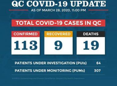 Nine recover (Eagle News)–The number of coronavirus disease 2019 cases in Quezon City has reached the 100 mark. According to the city government, of the 113 COVID-19 cases recorded, 19 died and 9 have recovered. Patients under probe are 64 while patients under monitoring have reached 307. The Philippines has confirmed over 1000 COVID-19 cases.