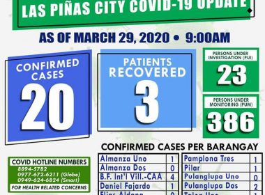 (Eagle News)–The number of coronavirus disease 2019 cases in Las Piñas has risen to 20. The city government said of the 20, one was from Almanza Uno, Barangay Daniel Fajardo, Pamplona Tres, Pilar and Talon Uno; four from BF International Village CAA; two from Manuyo Dos, Pulanglupa Dos and Talon Dos and Talon Kuwatro; and three from Zapote. Three patients were under investigation while 386 were patients under monitoring. The Philippines has so far recorded […]