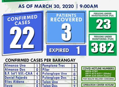 (Eagle News)–The Las Piñas City government has confirmed 22 coronavirus disease 2019 cases. The city government on Monday, March 30, said of the 22 cases, one was from Almanza Uno, four from BF International Village-CAA, one from Barangay Daniel Fajardo, two from Manuyo Dos, three from Pamplona Tres, one from Pilar, two from Pulang Lupa Dos, and one from Talon Uno. Talon Dos and Zapote have recorded two and three cases, respectively. The city government […]