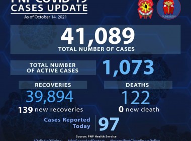(Eagle News) — Ninety-seven more COVID-19 cases have been reported among police personnel. The Philippine National Police said the additional data pushed the total COVID-19 cases in the PNP to 41,089. Of these, 1073 are active. The PNP said recoveries are now at 39894 with the addition of 139 recoveries. The COVID-19 death toll among police personnel remains at 122 with no additional deaths reported. The police are among the priorities in the country’s COVID-19 […]